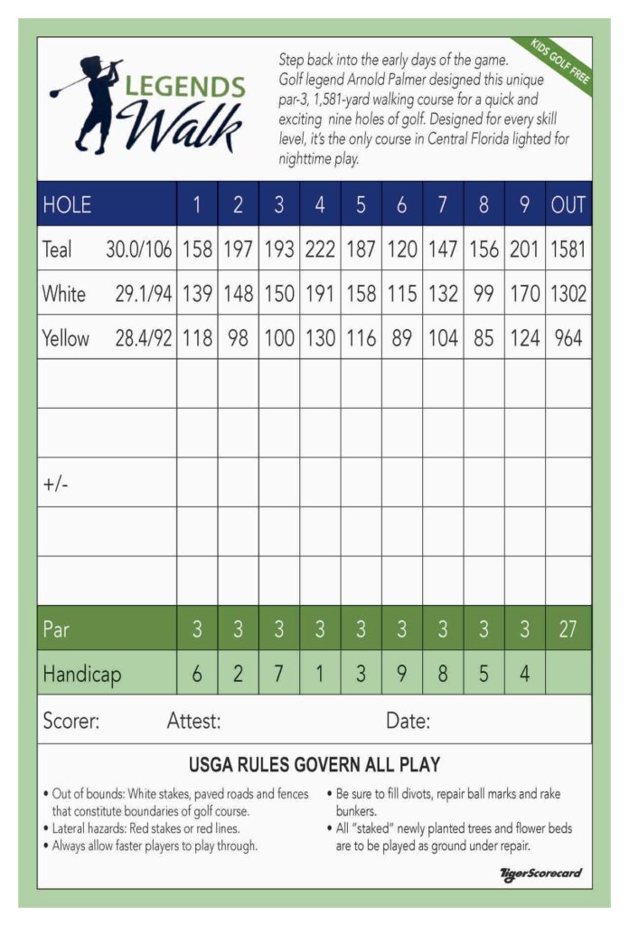 Legends Walk at Orange Lake Resort is a 9-hole, par-3 walking course designed for quick, fun golf in the North Village of the property. With stadium-style lighting for night play, a certified FootGolf layout, and an easy walking routing, it’s one of the most flexible and family-friendly golf options at Orange Lake.
